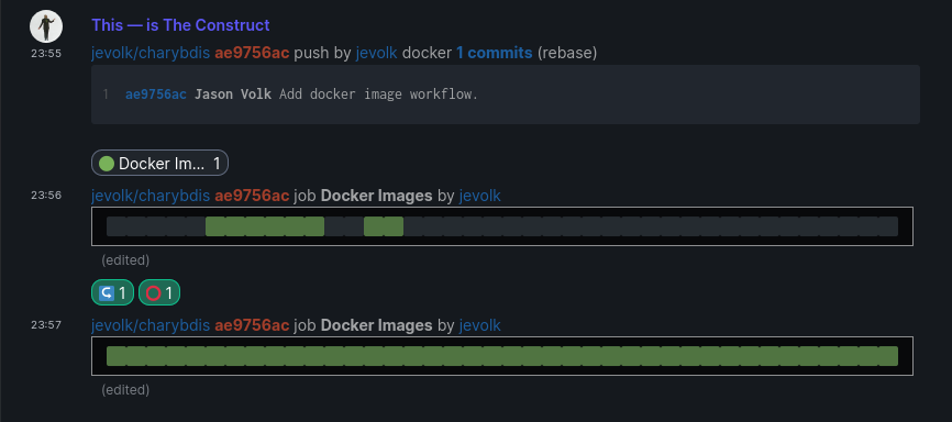 Construct features a Github webhook bot built into the server as a loadable module. This is something which existed from the very first days of the project and something I've worked on intermittently. For those that don't remember shortly after reactions were released in Riot, Construct was the first to make use of them as status indicators for continuous integration by reacting with π‘ and π’. Sometime later we were one-upped by the creativity of the folks over at #nheko whose bot sends a very baroque set of reactions for individual Gitlab jobs.